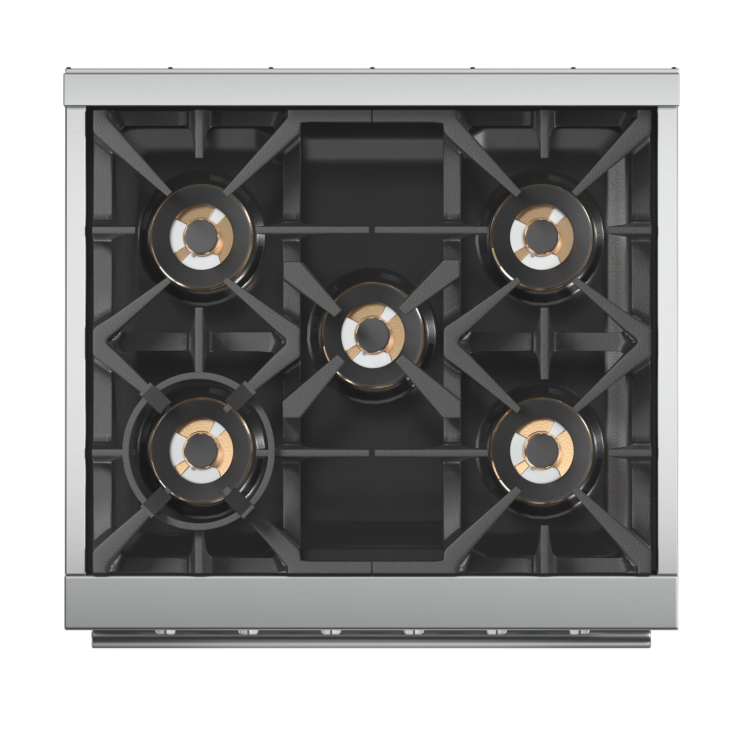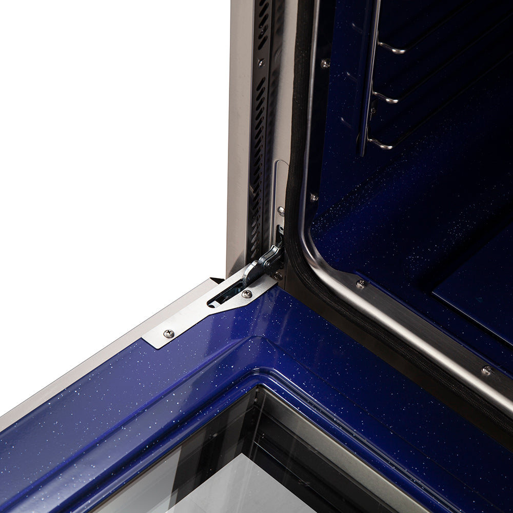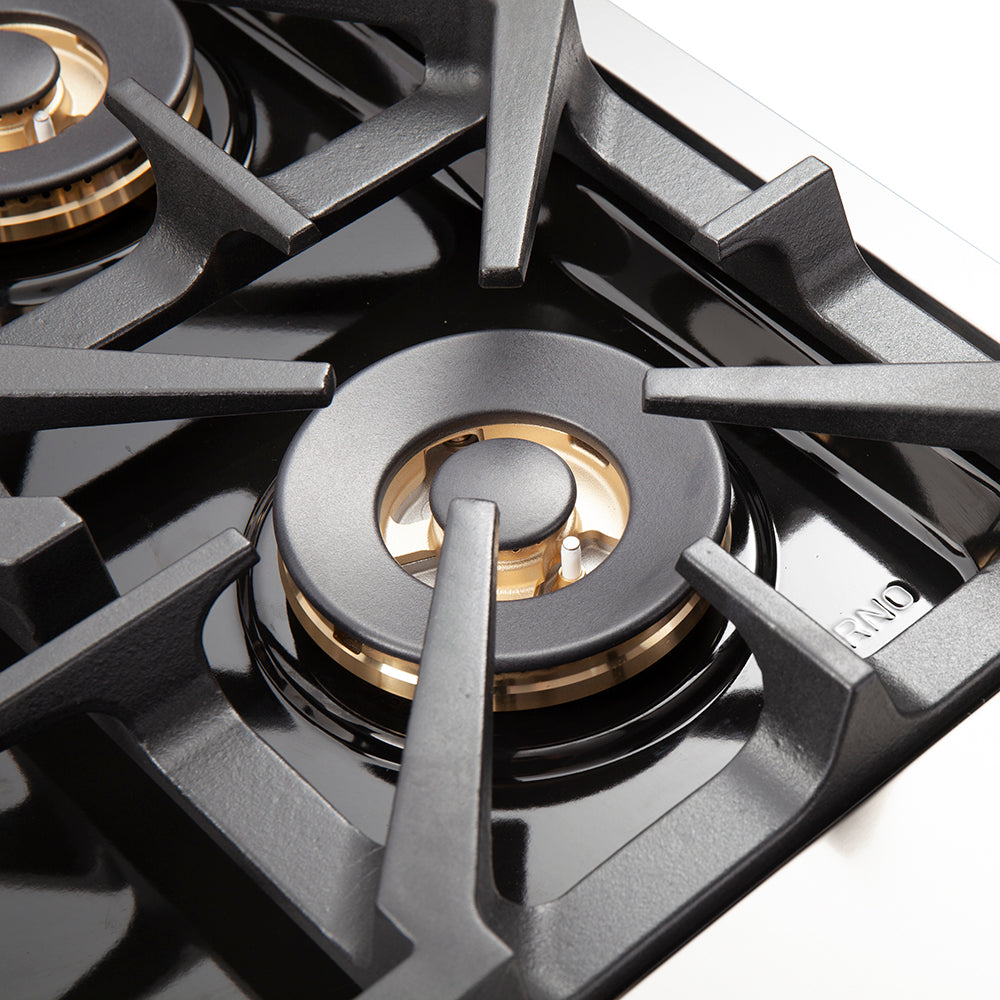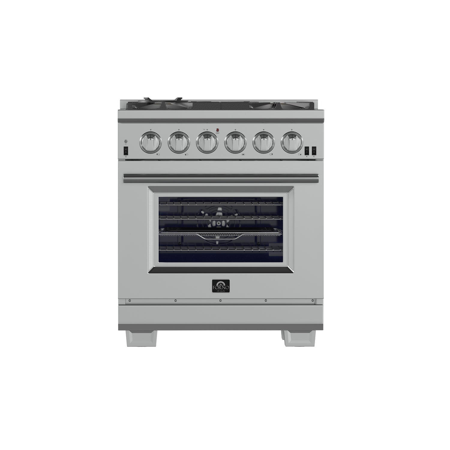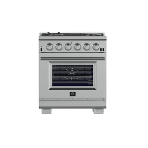 The Forno Capriasca 30 Inch Gas Range enhances your home kitchen with professional styling and performance through its durable and beautiful 304-grade stainless-steel design. The cooking surface features 5 sealed dual-ring brass burners, totaling 100,000 BTU. All burners, each at 20,000 BTU, can simmer precisely at 1,000 BTU. Continuous heavy-duty cast-iron grates facilitate easy sliding of pots or pans off heat over the enamel cooktop cavity, simplifying spill cleanup. The 4.32 cu. ft. gas oven, with a 30,000 BTU output and infrared red mesh broiler, enclosed in a blue enamel interior, offers optional convection for precise, and consistent cooking on multiple levels. For convenient viewing, a 3-layer glass oven door window is included. The package includes 3 telescopic stainless-steel oven racks, wok support, and an LP conversion kit. Additionally, zinc-coated illuminated metal knobs with bezel rings ensure enduring beauty.