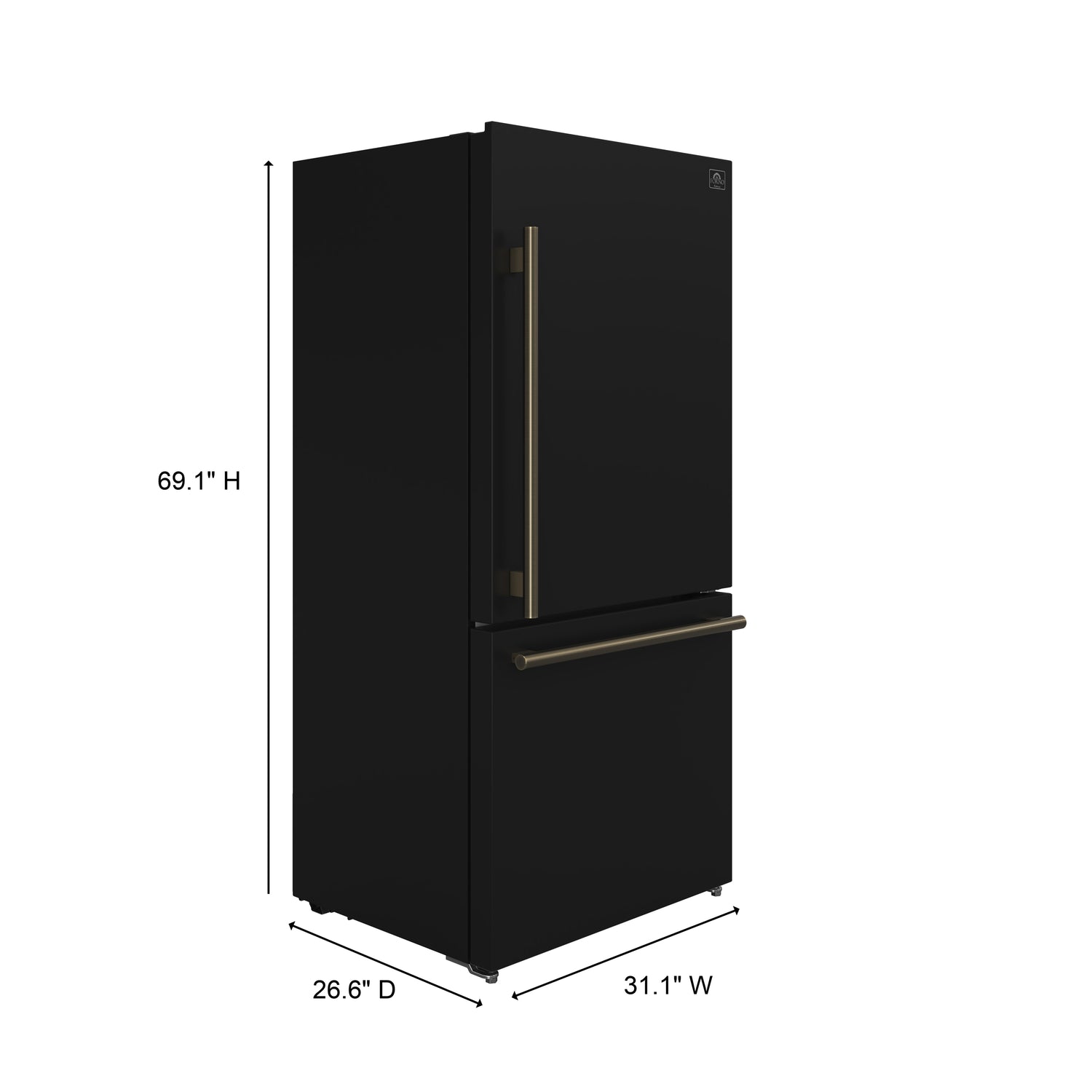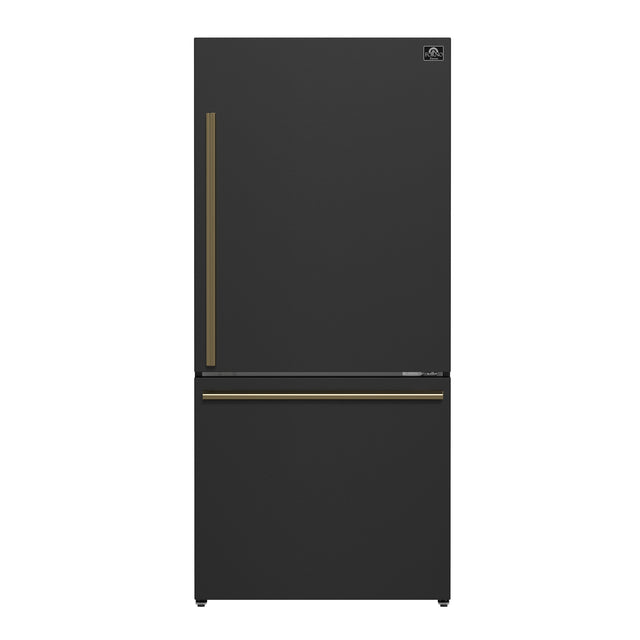 Introducing the FORNO 31 Inch Milano Espresso Bottom Freezer Refrigerator that seamlessly blends style and functionality. Its compact 31 Inch size and 17.2 cu ft capacity offer ample storage without compromising aesthetics. Two full-width freezer drawers optimize organization, while digital touch control ensures precise temperature settings and real-time monitoring. The black finish door maintains a modern look effortlessly. Swift temperature adjustment with Super Cool and Super Freeze safeguards your groceries quality. ENERGY STAR Certified for efficiency, and high-efficiency LED lighting reduces food spoilage. Antique brass handles add an elegant touch, and adjustable features, including shelves, door bins, and a full-width crisper drawer, enhance user-friendliness. Upgrade your kitchen with style, convenience, and freshness!
