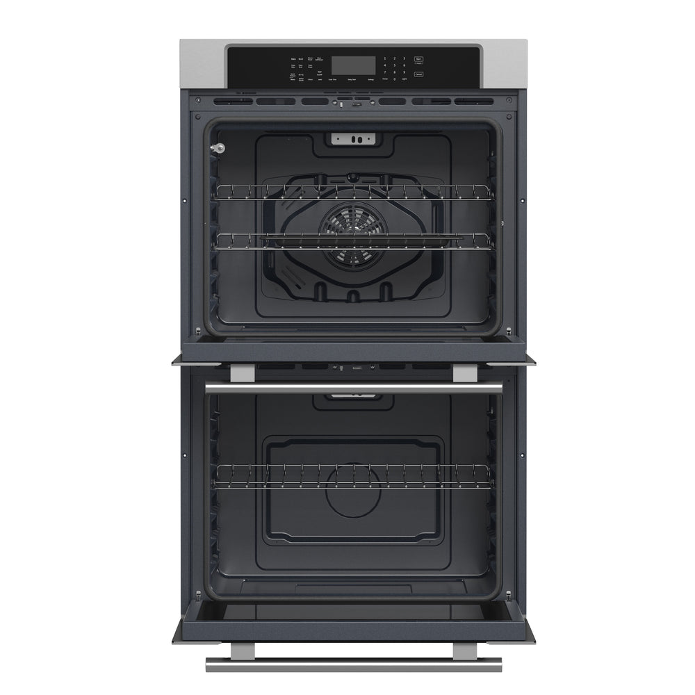 The Forno Villarosa 30 Inch double electric wall oven has a combined capacity of 10 cu. ft. The upper oven is equipped with true european convection fans, maintaining a consistent uniformed oven temperature for evenly cooked meals. Touch controls and LCD display for air-fry function, bake, broil, roast, or warm/proof make it a truly versatile addition to your kitchen. Includes 3 electroplated racks and steam clean pan with delay start/self cleaning.