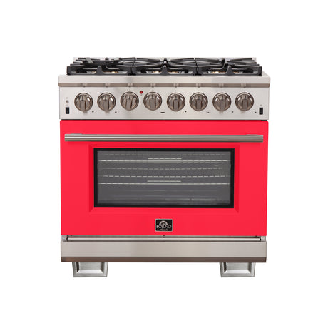 Forno Capriasca 36-Inch Freestanding Dual Fuel Range, 6 Burners, True Convection Oven, Red Door
