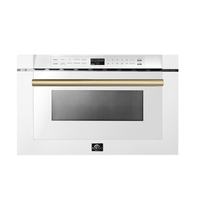 Upgrade your kitchen with the Forno Capolivera 24" Microwave Drawer, designed for effortless cooking. Featuring a 1.2 cu. ft. capacity, this white microwave with antique brass accents delivers 1,500 watts of power for fast, even heating—boiling water in just 1 minute and 50 seconds. With 11 power levels, you can precisely control cooking temperatures for everything from reheating to gourmet prep. Glass touch controls and an LED display offer a modern, user-friendly experience, while pre-programmed settings make it easy to melt butter, chocolate, and more. Enjoy versatile cooking modes, including defrost, popcorn, and beverage heating. The spacious interior accommodates 7-inch coffee mugs and 16 x 16-inch dishes, making it perfect for everyday use.