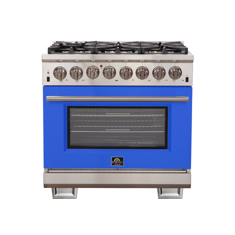 Forno Capriasca 36-Inch Freestanding Dual Fuel Range, 6 Burners, True Convection Oven, Blue Door