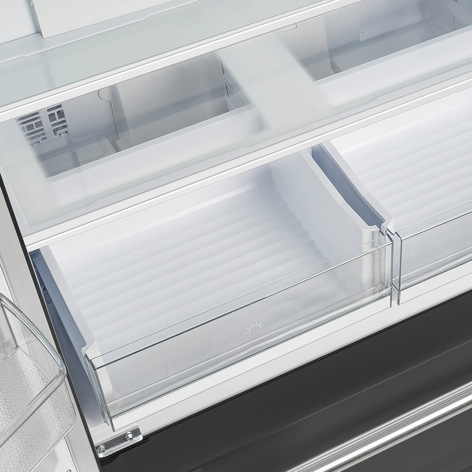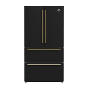 Upgrade your kitchen with the Forno Moena 36" Built-In French Door Refrigerator in black with antique brass handles, designed for seamless integration and premium performance. Powered by a high-efficiency inverter compressor, it ensures energy savings, quiet operation, and precise temperature control to keep your food fresher for longer. The frost-free multi-airflow cooling system maintains consistent temperatures throughout its 19.2 cu. ft. capacity, providing optimal food preservation with adjustable shelving for versatile storage. The 12.1 cu. ft. fresh food section includes three glass shelves (two adjustable), two drawers, and generous door storage to keep groceries organized. The 7.2 cu. ft. freezer offers two pull-out drawers, a slide-out tray, and an automatic ice maker producing up to 4 pounds of ice daily, ensuring convenience for every occasion. With an intuitive LED touch panel, you can effortlessly control temperature settings and functions. Energy Star Certified, this built-in French door refrigerator operates efficiently while minimizing food spoilage with bright, high-efficiency LED lighting for superior visibility.