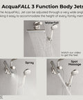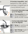Upgrade even the smallest bathroom into a personal spa with the FORNO ACQUA Mini AcquaSPA Shower System. Ideal for apartments, guest suites, or compact layouts, this sleek 3-in-1 design features an oversized 9" rain shower head for full-body coverage, a 5 function ergonomic handheld, and a revolutionary 10-1/2 in. AcquaFALL Waterfall Jet for soothing flow or targeted relief. The wide-angle jet adjusts to different user heights for personalized hydrotherapy. With a powerful flow rate, it delivers a satisfying experience without compromise. Easy DIY wall-mounted installation fits standard plumbing. Finished in brushed nickel, the Mini AcquaSPA combines high performance, timeless style, and space-saving convenience.