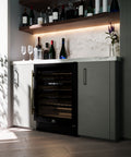 The Bacchino 24 Inch Wine Cooler in Black with Antique Brass Handle offers a flexible design that can be built-in or freestanding, making it a perfect fit for any kitchen or home bar. With dual temperature zones, it stores up to 51 bottles at optimal conditions ranging from 40°F to 65°F. Triple-layer anti-UV glass doors protect your collection, while a black stainless steel cabinet with fingerprint-resistant finish and antique brass handles ensures long-lasting durability. Telescopic shelves, charcoal filters, and a quiet compressor cooling system provide both convenience and performance for serious wine enthusiasts.