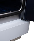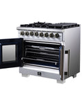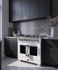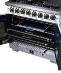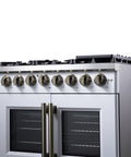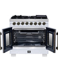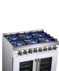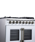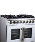 The Forno Capriasca 36 Inch French Door Dual Fuel Range in white with antique brass accessories brings professional style and high performance cooking into your home kitchen. Its signature French doors open outward, providing up to 12 inches of extra clearance for easier oven access. The range top features six sealed dual-ring brass burners with a powerful 120,000 BTU total output, offering the flexibility to achieve both intense searing and delicate simmering for sauces or melted chocolate. Heavy duty continuous cast iron grates ensure stability and smooth movement of cookware, while the recessed enamel cooktop cavity contains spills for easy cleanup. Inside, the 5.36 cu. ft. true convection oven delivers 6,300 watts of cooking power for fast, precise, and consistent results. A speckled blue enamel interior enhances durability and makes maintenance simple, while the triple-layer glass oven door window allows clear visibility without losing heat. Every detail is designed for performance and convenience, with included accessories such as an LP conversion kit, three stainless steel telescopic oven racks, wok support, reversible griddle, rotisserie kit with skewers, and an air fry basket with rack and drip pan.