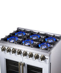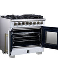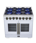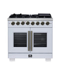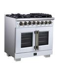 Forno Capriasca 36 Inch Freestanding French Door Dual Fuel Range in White with Antique Brass Accessories, 6 Burners, True Convection Oven
