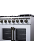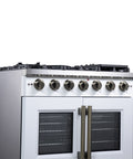 The 36 Inch Forno Capriasca French Door Gas Range in White elevates your home kitchen with professional style and performance. Its unique French doors provide an extra 12 Inch of access space to the oven. The range top boasts 6 sealed dual-ring brass burners, delivering a total output of 120,000 BTU for precise tasks like simmering or melting chocolate. The heavy-duty continuous cast iron grates ensure stability, covering a recessed enamel cooking surface cavity that contains spills for easy cleaning. The 5.36 cu. ft. gas oven, with a 30,000 BTU output, features a speckled blue enamel interior, convection fan, and a 3-layer glass oven door window for fast and precise cooking. The package includes an LP conversion kit, 3 stainless steel telescopic oven racks, wok support, reversible griddle, rotisserie kit, skewers forks, air fry basket and drip pan. The illuminated zinc-coated metal knobs with bezel rings add a touch of elegance that lasts for years.