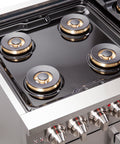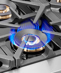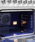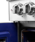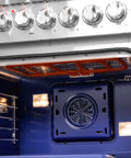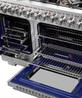 Introducing the Forno Capriasca 48-Inch French Door Dual Fuel Range, which seamlessly blends professional styling and performance into your home kitchen with its durable stainless-steel design. The gas rangetop features eight sealed dual-ring brass burners with a total output of 160,000 BTU, perfect for everything from simmering sauces to melting chocolate. Its heavy-duty continuous cast iron grates provide maximum stability and mobility over a recessed enamel cooking surface, making spills easy to manage and clean. The double electric ovens offer a combined capacity of 6.58 cu.ft. and a total output of 9,700 Watts, enclosed in speckled blue enamel interiors with tempered three-layer glass oven door windows. The right-side oven includes a true convection fan function. Accessories include an LP conversion kit, six stainless steel telescopic oven racks, a wok ring, a reversible grill/griddle, a rotisserie kit with skewers and forks, and an air fry basket with a rack and drip pan. Additionally, zinc-coated metal knobs with bezel rings maintain their aesthetic appeal for years.