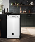 The Forno Polo 18" Dishwasher in white delivers powerful cleaning performance in a compact design, making it ideal for small kitchens, apartments, and tight spaces. Its sleek stainless steel finish adds a modern touch while ensuring durability and easy maintenance. With multiple wash cycles, including Heavy, Normal, and Quick Wash, this dishwasher adapts to your needs for a spotless clean every time. The adjustable top rack accommodates tall items up to 11 inches, while the dual spray arm system provides thorough, streak-free washing. Designed for efficiency, it is Energy Star Certified, helping reduce utility costs without compromising performance. Enjoy a quieter kitchen with ultra-low 52 dBA operation, and experience the convenience of a heated drying system that leaves dishes spotless and ready to use. With a user-friendly front control panel, a child lock safety feature, and an ADA-compliant design, the Polo combines compact convenience with premium functionality.