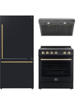 FORNO Premium 3-Piece Kitchen Bundle - Leonardo Espresso 30" Black Range, 30" Black Range Hood, 31" Black Bottom Freezer Refrigerator - FBDL-001-02US