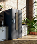 The Forno Salerno 36" Side-by-Side Refrigerator in black combines seamless integration with modern functionality. Designed for efficiency, its inverter compressor ensures quiet operation and precise temperature control, while the frost-free multi-air flow system keeps groceries fresh. With a spacious 20 cu. ft. capacity, this Energy Star Certified refrigerator features adjustable shelving, a 13.48 cu. ft. fresh food section with spill-proof shelves, storage drawers, and substantial door storage. The 6.53 cu. ft. freezer includes multiple shelves, bins, and drawers for easy organization. A built-in water and ice dispenser with a touchscreen panel offers effortless access to ice and temperature settings. Bright LED lighting enhances visibility while minimizing spoilage, making this refrigerator a stylish, high-performance addition to any kitchen.