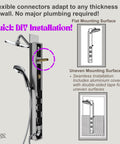 Upgrade your bathroom with the sleek, mirror-finished FORNO ACQUA AcquaSPA Shower Panel, where innovative features meet everyday practicality. Designed for easy DIY wall-mount installation, it connects to your existing plumbing with no renovation required. Relax beneath the oversized rain shower head or enjoy the flexibility of a 5-function ergonomic handheld and 3 body jets for full-body hydrotherapy. Perfect for relieving stress, and refreshing your senses. The revolutionary SensoTEMP strip changes color with water temperature, blue for cool, purple for warm, and red for hot, plus a flashing red alert to help prevent scalding. All this with no need of power. Combining contemporary style, water-saving design, and spa-like comfort, AcquaSPA is your new daily escape.