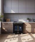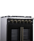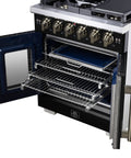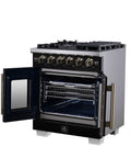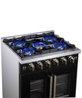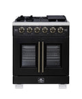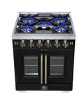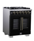 The 30 Inch Forno Capriasca French Door Gas Range blends professional style and durability with its Black design. Featuring unique french doors for extra oven access space, a rangetop delivering 100,000 BTU with 5 dual-ring brass burners, and heavy-duty cast iron grates over a recessed enamel cooking surface for easy cleaning. The 4.32 cu. ft. gas oven with 30,000 BTU output, convection fan, and 3-layer glass oven door window ensures precision cooking. Includes a LP conversion kit, 3 telescopic oven racks, wok-ring, reversible griddle, rotisserie kit, air fry basket and drip pan. Zinc-coated metal knobs with bezel rings add a touch of elegance.