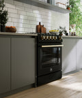 The Forno Leonardo 30" gas range in black combines modern design with professional-grade performance. Its powerful cooktop delivers 39,500 BTU across continuous cast iron grates, providing stability and effortless cookware movement. The deep recessed black enamel surface simplifies cleanup, keeping spills contained. The spacious 5.0 cu. ft. convection oven offers 22,500 BTU of broil and bake power, with two adjustable rack heights and a high-powered convection fan for even heat distribution. Designed for reliability, the auto re-ignition feature ensures consistent performance, while natural gas compatibility and an included propane conversion kit provide flexible installation options.