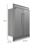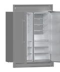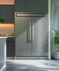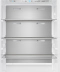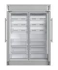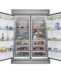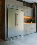 The Forno Maderno combines two 28 Inch refrigerators with decorative trim grill, extending to a 60 Inch width for a built-in appearance, harmoniously blending style with convenience. This combo offers ample storage space totaling 27.2 cu.ft. They feature customizable cooling with convertible function and total no frost technology, eliminating tedious defrosting. The side-by-side door design integrates seamlessly, while elegant glass shelves with silver trim and practical plastic door balconies enhance appeal and storage. Effortlessly switch between Fahrenheit and Celsius, aided by LED lighting for easy item location. Six glass shelves and six plastic drawers with silver trim provide flexible storage, and temperature settings are easily managed with the electronic touch control panel. The VCM door panel and metal back ensure durability, and the combo is T Climate Class certified with an E-star energy rating for sustainability.