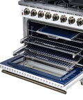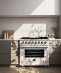 The Massimo 36 inch dual fuel range delivers powerful performance with elevated style. It features six sealed gas burners and matte cast iron grates, plus included accessories like a wok ring and removable griddle. The 5.36 cu. ft. electric oven offers true convection cooking, dual-element broiling, and five baking modes for maximum versatility. Designed in a sleek white finish with antique brass handles, this range includes a built-in air fryer basket, steam-clean oven, and a speckled blue enamel interior. LP gas convertible and suitable for both freestanding or built-in installations.