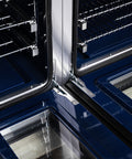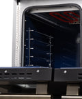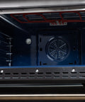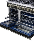 The Massimo 48 inch dual fuel range offers serious cooking power for high-performance kitchens. With 8 sealed gas burners and durable matte cast iron grates, it’s built for everything from rapid boiling to low simmers. The spacious 6.58 cu. ft. electric oven features true convection, multiple bake and broil modes, and a built-in air fryer basket for healthier meals. Finished in a bold black with antique brass handles, it also includes a wok support, griddle, and a steam-cleaning function for easy maintenance. The speckled blue enamel oven interior adds style and visibility. LP convertible and designed for either freestanding or built-in installation.