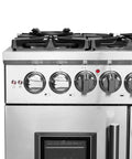 Introducing the Massimo 48 Inch French Door Dual Fuel Range, expertly combining professional style and durability in your home kitchen with its robust stainless-steel construction. The rangetop boasts eight sealed burners, delivering a total of 107,000 BTU, including a 20,000 BTU dual-ring brass burner that achieves a precise 1,000 BTU simmer. Continuous cast iron grates offer stability and contain spills on the enamel cooktop for easy cleaning. The ovens provide a combined capacity of 6.58 cu.ft. and a total power output of 9,700 Watts, suitable for baking, roasting, and broiling. The interiors feature impressive blue enamel for easy maintenance, and the three-layer glass oven doors ensure heat retention and visibility. The main oven includes a true convection fan. Accessories include four telescopic oven racks, wok support, two griddles, an air-fryer kit with drip pan, a NEMA 14-50P power cord, and an LP conversion kit. The high-grade stainless steel body and illuminated zinc knobs make the Massimo a stylish, lasting addition to your kitchen.