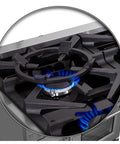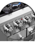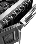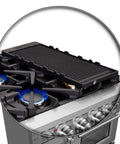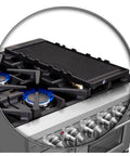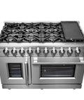 The Massimo 48 Inch French Door Gas Range delivers professional style and durability to your home kitchen with its robust stainless-steel design. The rangetop features 8 sealed burners, 107,000 BTU output which one is a 20,000 BTU dual-ring brass burner that can reach a simmer of 1,000 BTU for precise simmering. Continuous cast iron grates ensure stability over the enamel cooktop cavity, making spills easy to clean. The 6.58 cu.ft. combined oven capacity delivers a total output of 44,000 BTU, encased in a speckled blue enamel interior for easy maintenance. The 3-layer glass oven door window provides heat retention and a clear view. The main oven, with a 4.32 cu.ft. capacity and convection fan, enhances cooking efficiency. Included are 4 telescopic oven racks, wok support, two griddles, air-fryer kit with drip pan, and an LP conversion kit. Housed in a high-grade stainless steel body with illuminated zinc knobs, the Massimo offers a stylish, long-lasting addition to your kitchen.