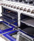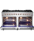 The Forno Massimo 60 Inch Gas Range harmonizes professional style and 304-grade stainless steel durability. Its 10 sealed burners, totaling 142,000 BTU, include two precision 20,000 BTU dual-ring burner that can simmer at 1,000 BTU. Continuous cast iron grates ensure stability on the enamel surface. Two convection ovens with a total capacity 8.64 cu.ft with 30,000 BTU Total Broil and Bake output each. Both ovens have an impressive blue enamel interiors allowing for easy cleaning and 3-layer glass oven door window provides both heat retention and an unobstructed view. It features 2 telescopic racks per oven, an air fryer kit, a wok support, two reversible griddle, an LP conversion kit, and durable zinc-coated metal knobs. Elevate your kitchen with performance, convenience, and enduring elegance.